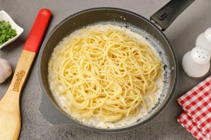 Когда соус закипит, добавьте предварительно отваренные спагетти. Я обычно отвариваю параллельно приготовлению соуса, что значительно экономит время. Готовьте спагетти в подсоленной воде согласно инструкции на упаковке.