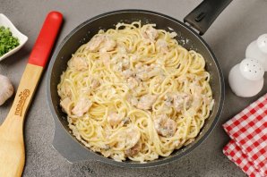 Хорошо перемешайте и прогрейте пару минут. Спагетти с консервированным лососем готовы.