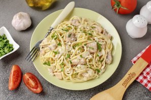 Приготовить спагетти с консервированным лососем можно буквально на скорую руку. Пока соус готовится у меня уже отвариваются спагетти, 20-30 минут и вкусный ужин готов. Такое блюдо выручит когда нет времени долго стоять у плиты, а приготовить нужно что-то питательное. По желанию можно добавить в соус нарезанный помидор или любые специи по вкусу