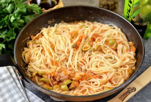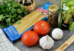 Спагетти с томатным соусом, оливками и каперсами