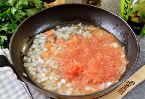 Разрежьте помидоры не четвертинки, мякоть натрите на крупной терке, переложите ее в сковороду, кожуру выбросьте. Тушите на умеренном огне, пока соус слегка не загустеет. При желании можно добавить немного томатного соуса.