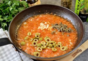 Нарежьте оливки кружочками, порубите чеснок и каперсы, переложите в соус. Прогрейте соус около минуты, посолите и поперчите по вкусу, добавьте немного сахара.