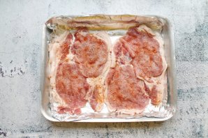 Противень застелить фольгой для выпечки и смажьте растительным маслом. Мясо нарежьте на стейки толщиной 1-1,5 см. Свинину отбейте, посолите, поперчите и выложите на противень.