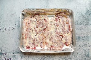 Смажьте отбитые стейки майонезом.