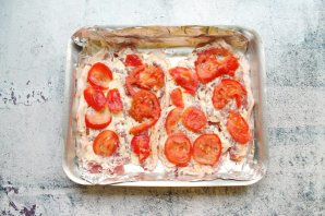 Помидоры порежьте на дольки и выложите на свинину.