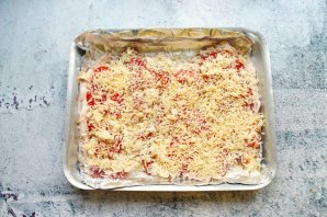 Сыр натрите на средней терке и посыпьте помидоры и мясо сверху. Поставьте противень с мясом в горячую духовку и запекайте при температуре 180 градусов в течение 30-35 минут, до золотистой корочки и золотистого цвета. Спустя время достаньте стейки из духовки и подавайте к столу.