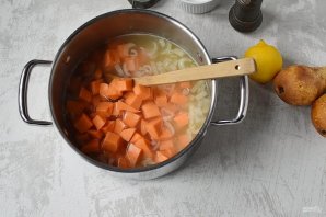 Добавьте нарезанный батат, слегка посолите и варите до мягкости овощей.