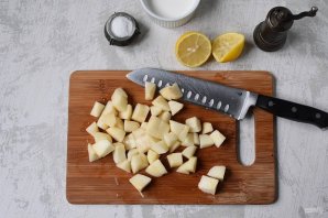Груши очистите от кожуры, нарежьте кубиками и сбрызните чайной ложкой лимонного сока.
