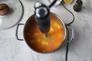Пюрируйте сварившиеся овощи до однородности.