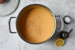Отложите пару ложек карамелизированной груши для гарнира и добавьте остаток в кастрюлю с супом. Влейте сливки. Снова пюрируйте суп до гладкости.