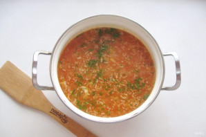 Когда рис в супе будет готов, добавьте томатную пасту с помидорами. Посолите по вкусу, добавьте приправы. Варите харчо еще 5-7 минут на минимальном огне.