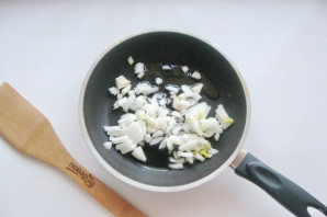 Репчатый лук очистите, помойте и мелко нарежьте. Выложите в сковороду. Налейте 20 мл. рафинированного подсолнечного масла и слегка поджарьте лук до прозрачности.