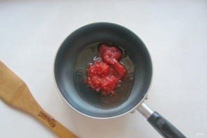 В сковороду налейте 20 мл. подсолнечного масла. Добавьте томатную пасту и помидоры, которые нужно предварительно измельчить любым способом. Припустите эти ингредиенты в сковороде в течение 5 минут.