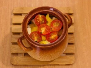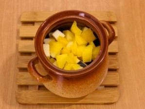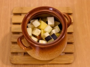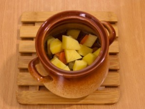 Достаньте горшочки из духовки. Добавьте в них картофель.