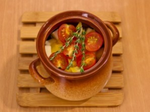 На помидоры кладем по 3 веточки тимьяна. Заливаем все водой, так чтобы покрылись помидоры. Закрываем горшочки крышками и отправляем в духовку на 1 час, температура 180 градусов.