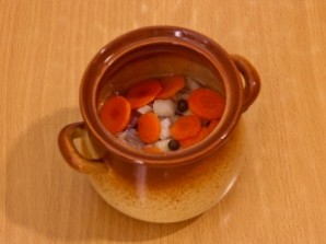 Сверху положите немного лука и моркови. Добавьте в каждый горшочек по несколько горошин перца. Налейте воду, чтобы закрыть мясо, лук и морковь. Закрываем горшочки крышечками и отправляем в духовку на 30 минут, температура 180 градусов.