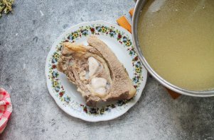 Говяжью грудинку вымойте, положите в кастрюлю, залейте холодной водой и поставьте на средний огонь. Доведите все до кипения, удалите пену и убавьте огонь. Все посолите и варите в течение 1-1.5 часа, до готовности мяса. Спустя время достаньте мясо, порежьте на кусочки, бульон процедите и добавьте говядину.