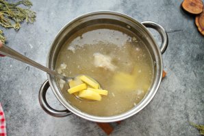 Кастрюлю с бульоном поставьте на средний огонь и доведите до кипения. Картофель порежьте соломкой и выложите в бульон. Варите картофель в течение 10 минут.