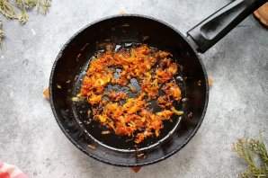 Пока варится картофель, сделайте зажарку. Для этого репчатый лук порежьте, морковь натрите на средней или крупной терке. В сковороду налейте растительное масло, выложите овощи и обжаривайте на среднем огне в течение 6-7 минут, перемешивая.