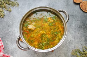 Суп доведите по вкусу на соль, поперчите, добавьте лавровый лист и варите в течение 7-10 минут, до готовности овощей. Зелень мелко порежьте, добавьте в суп, доведите до кипения и снимите с огня.