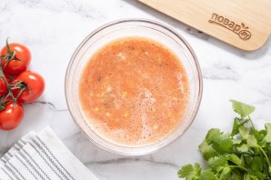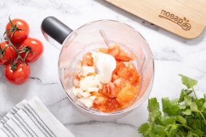 Помидоры и репчатый лук измельчите в блендере до однородной консистенции. Помидоры можно предварительно очистить от кожуры.