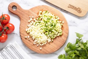 Соедините измельченные помидоры с луком, огурец и сельдерей вместе.