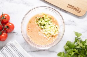 Огурец и стебель сельдерея нарежьте на мелкие кубики или натрите на крупной терке.