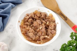 Налейте кипяток и добавьте измельчённый ножом чеснок. Количество воды зависит от желаемой густоты супа и объёма вашей посуды для аэрогриля.
