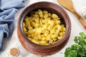 Сверху выложите нарезанный небольшими кубиками картофель.