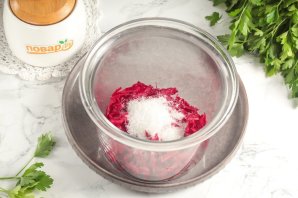 Натрите свеклу на терке и выложите в глубокую высокую емкость. Всыпьте соль и сахарный песок.
