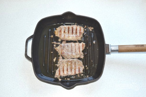 В зависимости от размера и толщины кусочков, жарьте свиную корейку на сковороде гриль от 5 до 12 минут с каждой стороны.