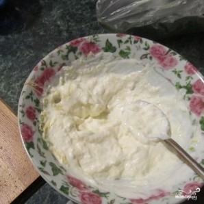 2. Мелко натереть сыр и выложить в миску. Добавить сметану и пропущенный через пресс чеснок, перемешать.