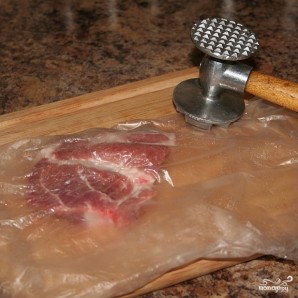 Кусок свинины промываем, нарезаем на крупные порционные куски, кладем в полиэтиленовый пакет и хорошенько отбиваем. Толщина - на ваше усмотрение.