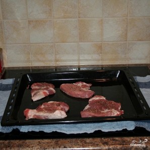 Выкладываем отбитые кусочки мяса на противень, смазанный маслом или застланный фольгой.