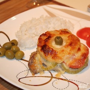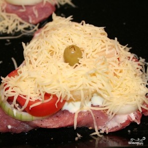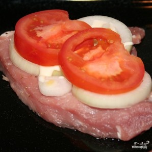 Помидоры и лук нарезаем тонкими ломтиками. Кладем на кусок мяса лук, смазываем майонезом, сверху укладываем кусок помидора.