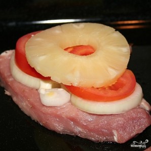 Сверху на эту конструкцию кладем ломтик консервированного ананаса (при наличии можно заменить свежим - будет еще вкуснее). Опять же, слегка смазываем майонезом.