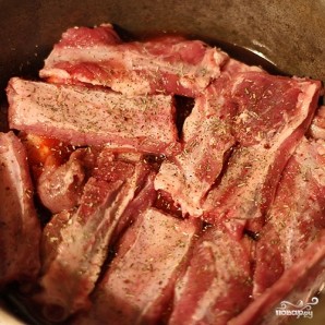 Свиные ребрышки помыть, порезать порционно. Посолить, поперчить.