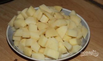 Очищенный и промытый картофель нарежьте кубиками. Добавьте его в бульон спустя 40-50 минут после варки курицы.