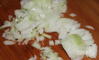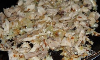 Лук обжарьте в разогретом масле до мягкости. Затем добавьте к нему нарезанную сваренную курицу. Обжарьте ингредиенты вместе до румяного цвета.