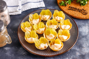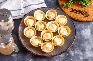 Тарталетки можно приобрести как песочные, так и вафельные, но помните, что последние очень быстро намокают, впитывая в себя влагу. Поэтому закуску готовьте прямо перед подачей к столу. Выложите плавленый сыр в тарталетки.