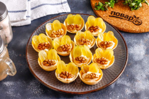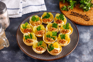 Ядра грецких орехов выложите в тарталетки после винограда. По желанию их можно измельчить и всыпать на тарталетки крошку либо заменить фундуком, арахисом и другими орехами.