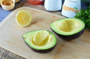 Разрежьте авокадо, удалите косточку, сбрызните мякоть лимонным соком, чтобы не потемнела.