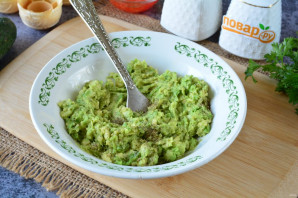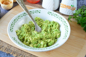 Достаньте мякоть авокадо из кожуры. Разомните мякоть авокадо при помощи вилочки.