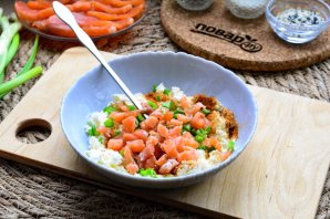 Добавьте в начинку нарезанную небольшими кубиками соленую форель и перемешайте.