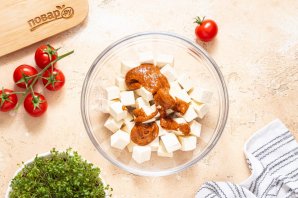 Переложите тофу в глубокую миску. Добавьте подготовленную пасту со специями.