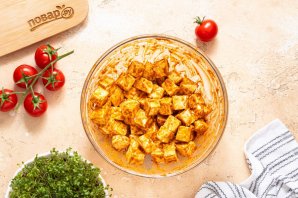 Все перемешайте, чтобы соус равномерно распределился по каждому кубику. Я обычно накрываю миску крышкой и хорошо встряхиваю.