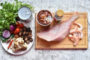 Подготовьте продукты для приготовления супа "Том Ям". Используйте любую морскую рыбу. Выпотрошите ее, очистите от чешуи и хорошо промойте.