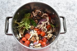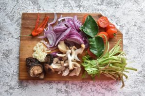 Подготовьте вкусовую основу для бульона. Отрежьте стебли кинзы. Помидоры черри разрежьте пополам. Красный лук нарежьте перьями. Сухие грибы шиитаки заранее залейте водой, чтобы они напитались влагой. Нарежьте вешенки. Красный перец разрежьте вдоль и удалите сердцевину с семенами. Измельчите чеснок.