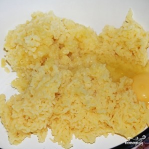 Первым делом картофель отварим до готовности и натрем на мелкой терке. Смешаем с яйцом.
