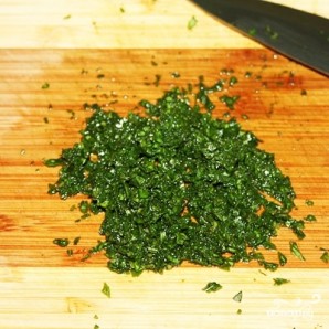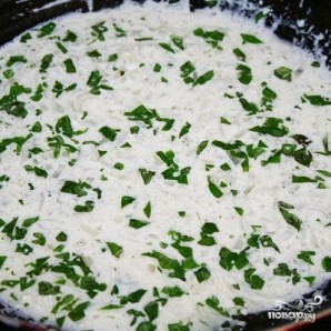 Пока ньокки в холодильнике, сделаем сметанный соус. Для этого обжарим в сковороду мелко нарезанные лук и чеснок, затем добавим сметану и немного воды. Перемешиваем, тушим до образования нужной консистенции, добавляем соль, перец и мускатный орех. В самом конце приготовления соуса добавляем нарубленную зелень (можно опять базилик).